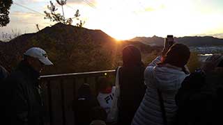 東の庄山から初日が昇りはじめます。奥の院の憩いの展望台にスマホを構える家族。 |